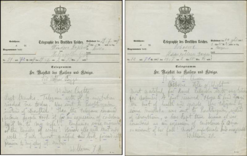 Wilhelm II, König von Preußen und Deutscher Kaiser, 2 eigenhändige Texte mit Unterschrift 'William I.R.' auf 2 Formularen 'Telegramm Sr. Majestät des Kaisers und Königs' , beide aufgegeben an Bord der Yacht ‘Hohenzollern’ vor Bergen (Norwegen) am 29. Juli 1899; eines an seine Großmutter die Königin Victoria von England, das andere an ihren Privatsekretär, Sir Arthur Bigge. Der Kaiser bedankt sich für eine Einladung und bedauert die verspätete Antwort, da das Telegramm mit der Einladung versehentlich nach Berchtesgaden (die Kaiserin hielt sich zu dieser Zeit dort auf) und nicht nach Trondheim weitergeleitet worden war.