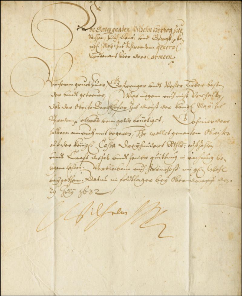 Wilhelm IV, Herzog von Sachsen (1598-1662, eigenhändige Unterschrift auf komplettem Faltbrief 1632 aus dem "Feldlager bey Oberndorff", an den schwedischen General Sigismund Heusnern von Wandersleben. Ein schöner Beleg aus dem 30-jährigen Krieg.