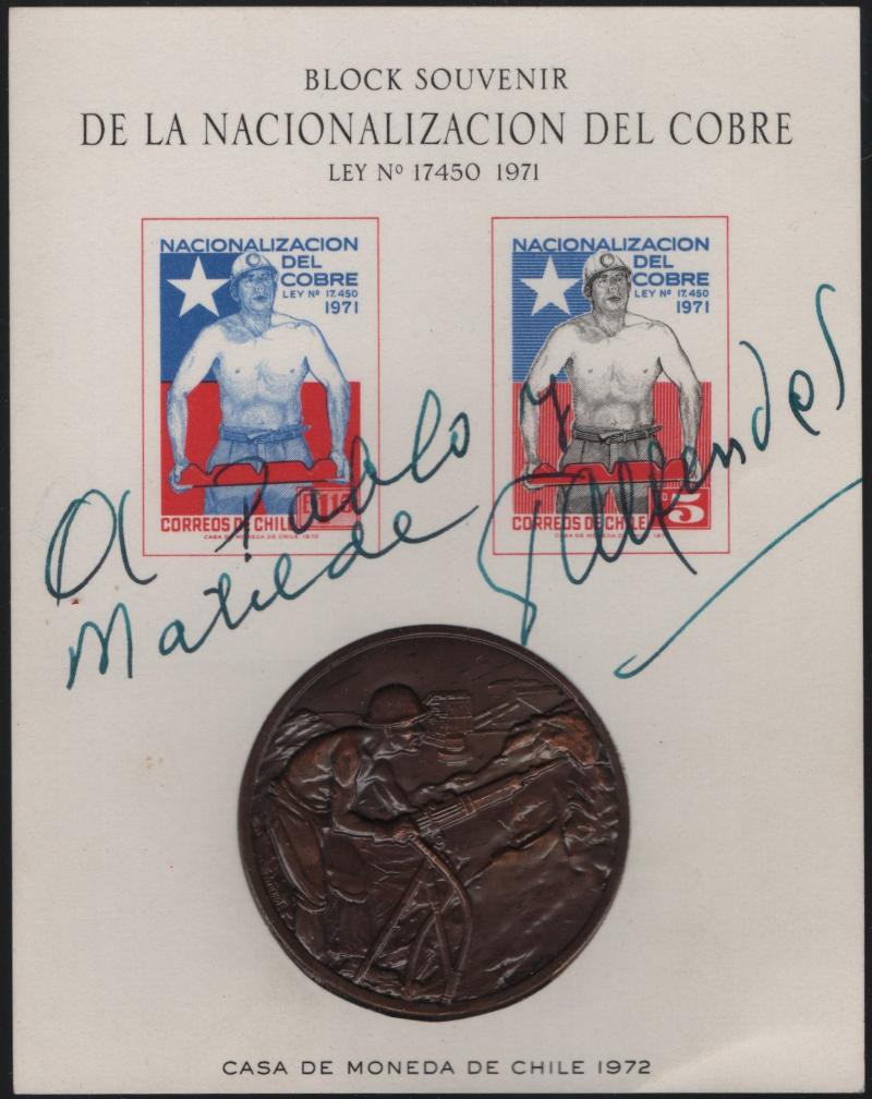 SALVADOR ALLENDE, President of Chile, inscribed & signed a special souvenir sheet of stamps issued in 1972 to publicize the nationalization of the copper industry (footnote Scott #423-24); VF (Image)