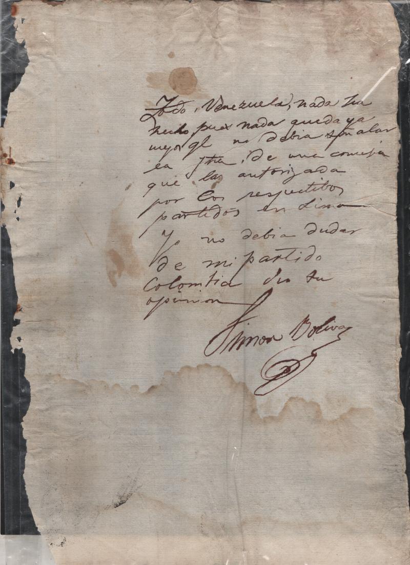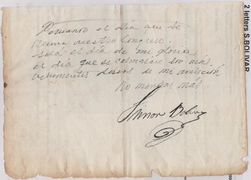 SIMON BOLIVAR, The Liberator, full page w/ water staining at bottom, undated 11-lined text above w/ full bold signature, mentions Venezuela and Colombia; F+ (Image)