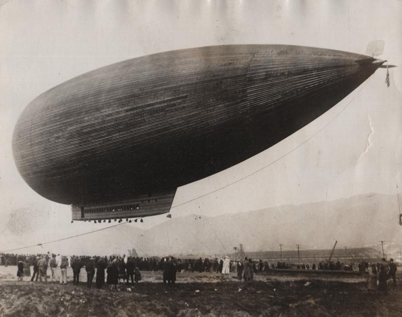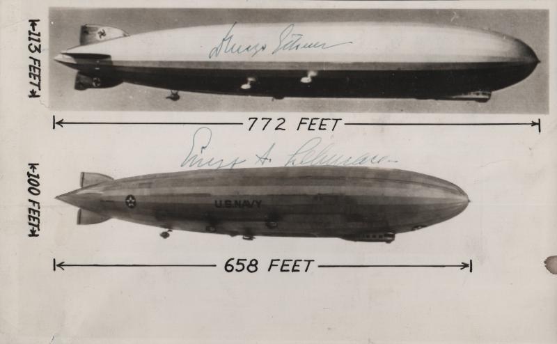 ECKENER & LEHMANN Signed 1936 press photo, in blue ink, photo is trimmed showing two airships Graf Zeppelin & Los Angeles (original photo had 3 ships per note on back); Lehmann would perish the next year in the Hindenburg disaster; VF (Image)