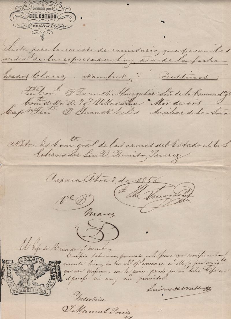BENITO JUAREZ 1856 Oaxaca State government document signed as Governor (later he became President of Mexico); other signatures & black state seal handstamp at LL; minor aging, F-VF (Image)