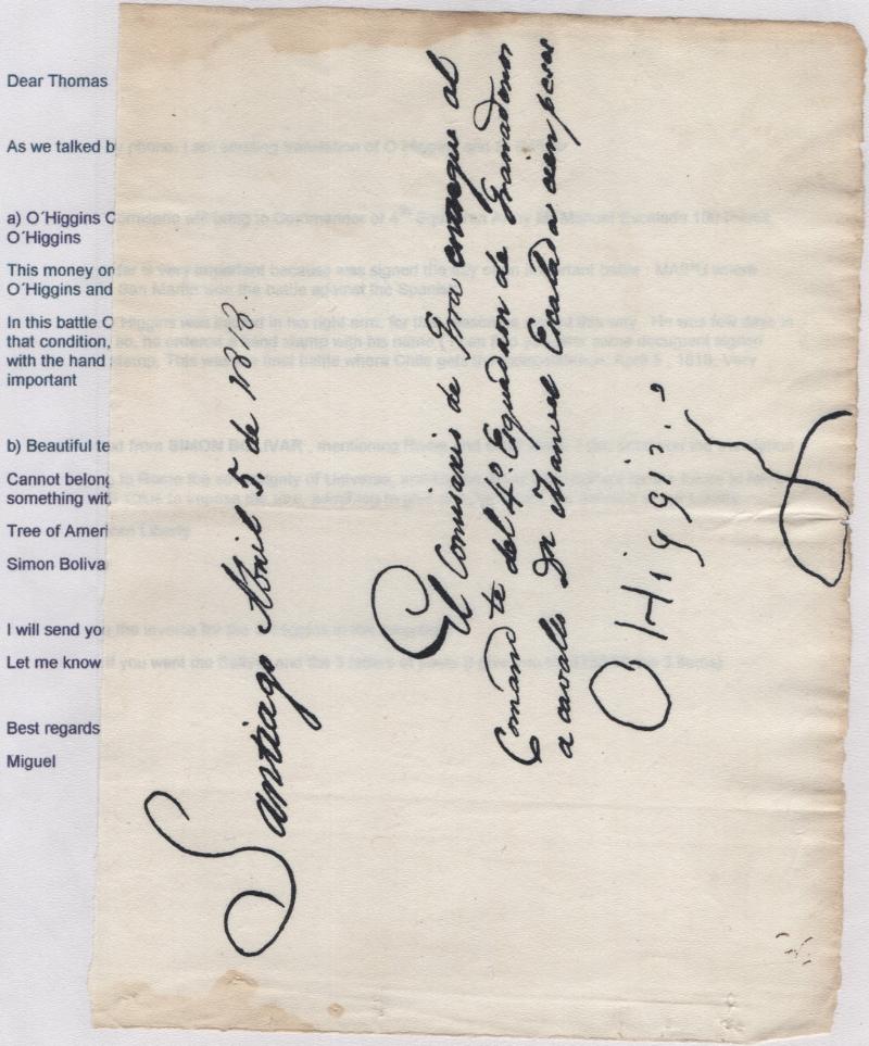 LATIN AMERICA Group of signed documents by various Founding Fathers of South American independence from Spain; incl Bernardo O'Higgins (5) from 1813-40 incl payment note during war; his father Ambrosio O'Higgins, Jose San Martin (4) incl one w/ extra signature of Gabriel Ocampo; Martin Guemes, Antonio de Sucre & Andres Bello (2); all w/ info from seller but no Certs; F-VF (Image)