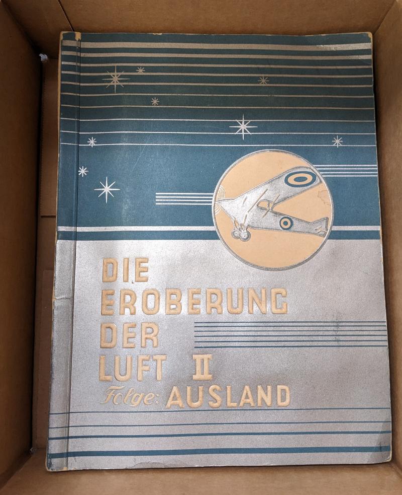 Die Eroberung der Luft 2-vol album by Garbaty Cigarette Factory in Berlin; appears cplt w/ small color cards, first volume on history of flight & diff types of craft; 2nd vol w/ airplanes of diff countries & their symbols; cards all VF w/ some wear to cover of 1st vol (Image)