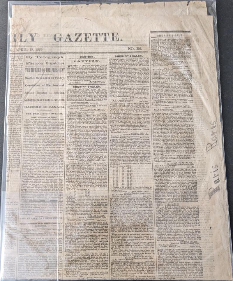NEWSPAPER Cincinnati Daily Gazette dated April 18, 1865, w/ news of various occupations across the South, stories of the Fall of Richmond, the attack on Seward & the movements of John Wilkes Booth; folded twice in plastic protector, stray pencil marks, some typical edge wear but in VF cond (Image)