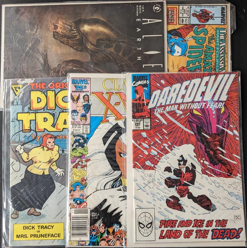 Stack (49) sleeved comics (some boarded), appear to be late 1980s/early 1990s w/ cover prices of 50¢ to $3.50; noted Marvel, DC & Dark Horse; noted Daredevil, Alien, Dick Tracey, X-Men, Spider Man (many), Ape City & more; gen XF (Image)