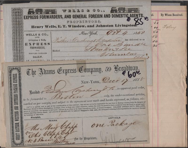 Accum (13) shipping receipts 19th Cent incl American Express, Adams Express, Benton & Barker Stage Co, Howard & Co Express, Kinsley & Co Express & Wells Fargo, mixed cond typical for this era (Image)