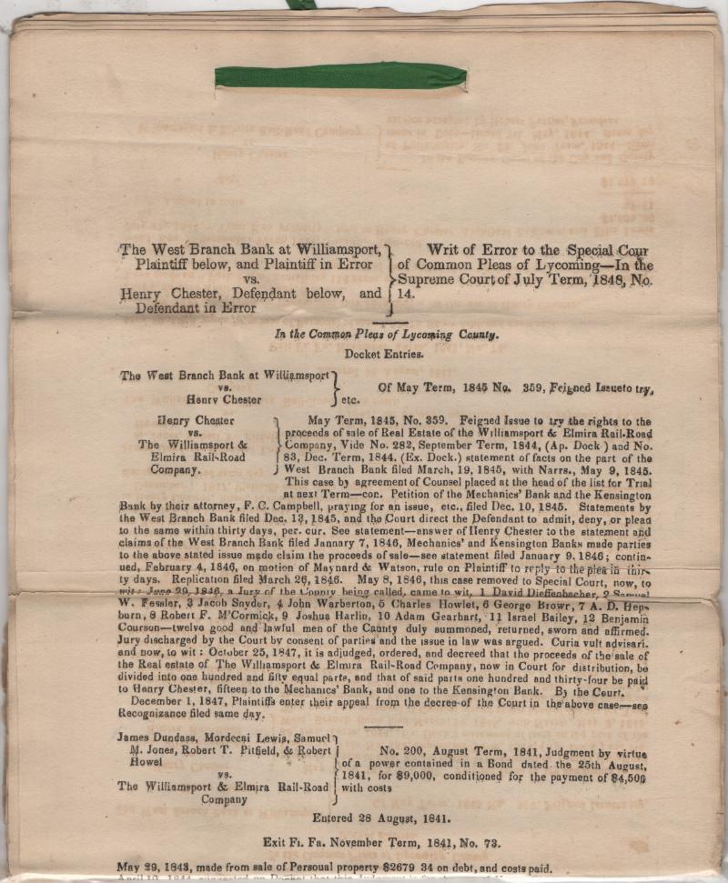 Selection of documents, mostly from Pennsylvania; incl 1841 court documents for Williamsport & Elmira RR, 1865 property document for Mahanoy & Broad Mountain RR, 1901 first mortgage for United Telephone & Telegraph Co; 1877 Indenture of Delaware, Lackawanna & Western RR; 1896 Catawissa RR Co lease; binder w/ numerous documents in page protectors, incl comml letterhead & invoices, most from Philadelphia & Pittsburgh 1850s-80s, railroad bills of lading, a few trade cards & more; did not see any revenue stamps; gen F-VF (Image)