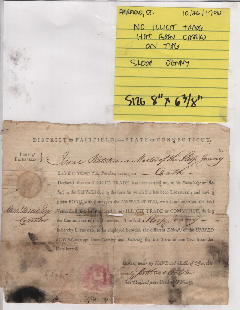 Accum, abt (80+) sailing ship documents 1780s to abt 1801, abt (28) pre-1800s incl ship cargo, manifesto, registry certification, statement of no illicit trading, ship owner statements, registry oath, certificate of enrollment & much more, high retail value, abt half on stkpgs in a binder & abt half loose in an env, most moisture damaged due to poor storage (Image)