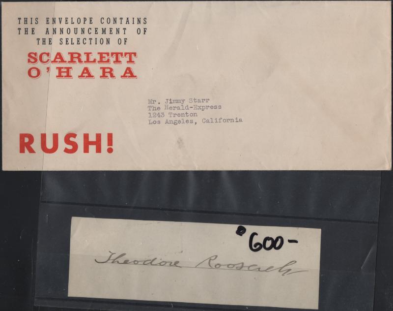 Accum (10) items incl Theodore Roosevelt autograph, Julia Grant 1902 funeral passes (2), Gone With the Wind adv env, cplt Oakland Bay Bridge invite, New Orleans history brochure, Boulder Dam brochure, booklet for 1926 Sesquicentennial & 1933 Century of Progress, fold-out ad for 1930 grand opening of NY Chrysler building w/ many pictures & leasing info, typical cond for this era (Image)