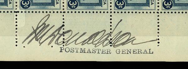 Jesse M. Donaldson, Postmaster General, bold signature with typed title below, in right-hand selvage of 3¢ Salute to Youth (#963) pane of 50; several stamps in left-hand column separated; any lines or "holes" in the image due to holder. (Image)