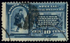 E1,10¢ Blue, Fine Used, close at top, lower left corner perf creased Cat($80) (Image)