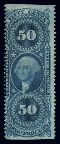 R60b,50¢ BLUE, ORIGINAL PROCESS, PARTIALLY PERFORATED (IMPERFORATED HORIZONTALLY), Fine-Avg perfs just in at left with large margins at top and bottom and with faint ms ccl, looks unused with partial original gum. Extremely scarce! Cat($5,000) (Image)