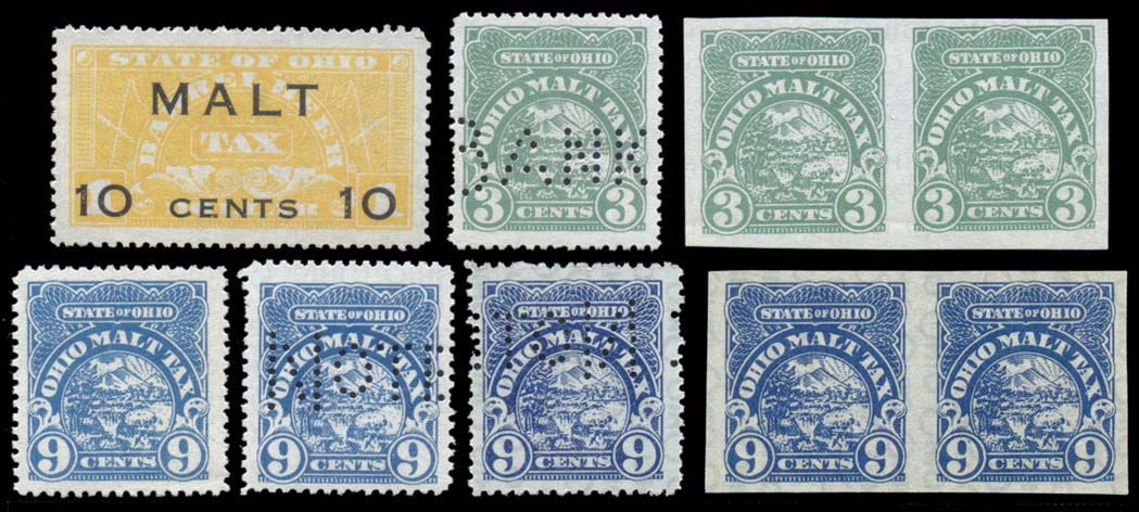 OH MA4-7,Ohio State 1933 Malt Tax Stamps, contains (5) mint singles and (2) mint imperf pairs. The mint LH imperf pairs are MA5a and MA7a. Mint singles including MA4, 5S, 6, 6S and 7S (S=Specimen perfin) Cat($76) (Image)