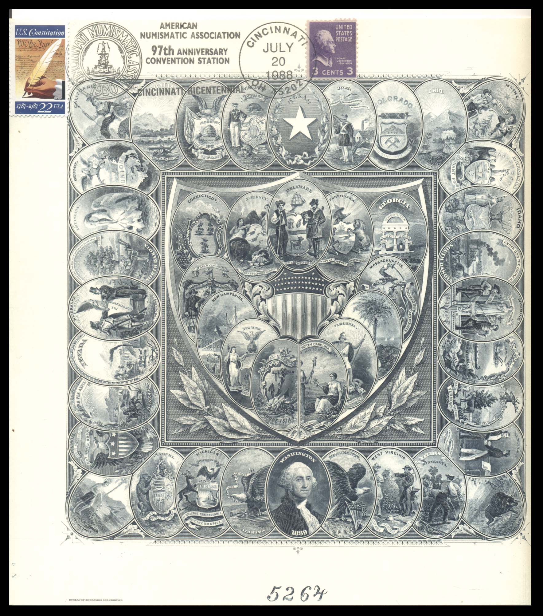 B117,BEP 1998 ANA (American Numismatic Association) Show Proof - State Shields in blue, show cancelled, same franking on card and folio, nos. 807 and 2360. Excellent condition, folio with tiny wrinkle upper left corner (Image)
