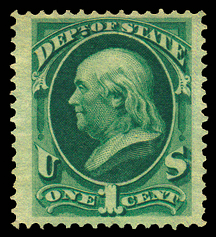 O57,1¢ State Dept., VF-XF NG, small crease at left, JUMBO wide margins and gorgeous color Cat($125) (Image)