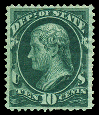 O62,10¢ State Dept., XF Unused, with couple short perforations and deep rich color Cat($120) (Image)
