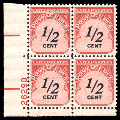 J88,½¢ Carmine Rose and Black, Lower Left Plate Block of 4 no. 26290, XF NH Cat($120) (Image)