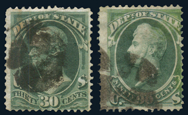 O65-66,24¢ and 30¢ State Dept., Green, O65 Fine-Avg with major repairs; O66 Fine with repaired tears at top and light horizontal crease. Attractive fillers Cat($410) (Image)