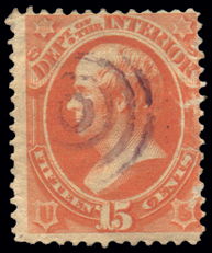 O102,15¢ Dept. of Interior, Fine-Avg, thin with 4-ring purple target ccl Cat($505) (Image)