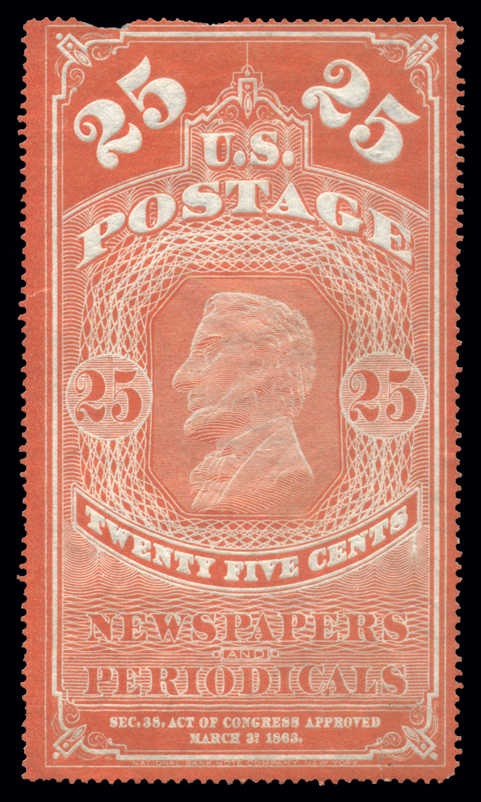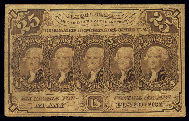 PC7,25¢ 1862 Postage Currency, Imperforate, (for currency collectors, this is FR #1281), VF, worn, but pretty clean Cat($165) (Image)