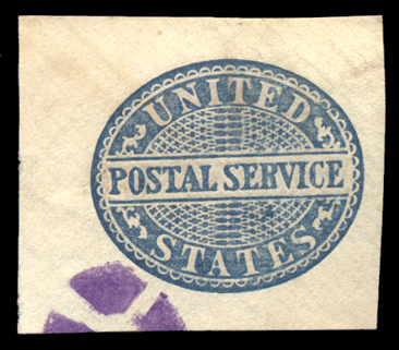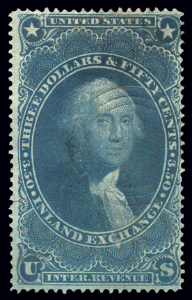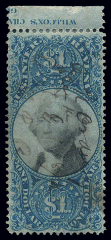 R118,$1.00 Blue and Black, Top Margin Single with partial inverted imprint at top, XF, with herringbone cut ccl and ms ccl. Imprint reads "WILLCOX'S CHA/GE" but the entire Imprint would read "WILLCOX'S CHAMELEON PAPER, PATENTED MAY 16th 1871/GEORGE T. JONES' PATENT, JULY 13th 1869". Seldom seen (Image)