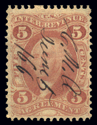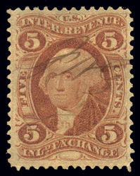 R27cvar,5¢ Inland Exchange, Red, Double Transfer at top and bottom, F-VF, ms ccl with double transfer visible in top and bottom words and the upper right and both bottom "5" ovals; not listed in Scott (Image)