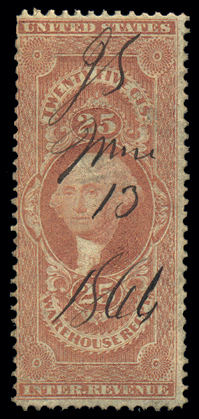 R50c,25¢ Warehouse Receipt, Red, Fine-Avg; just in at left with 1866 ms ccl and much of it's OG Cat($45) (Image)