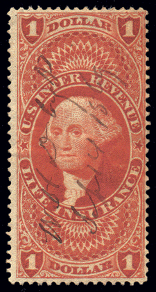 R71cvar,$1.00 Life Insurance, Red, Extra Frameline at right (Pos. 46) and faint Extra Frameline at Top (not mentioned or listed), Fine with light 1869 ms ccl and bright color Cat($50) (Image)