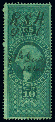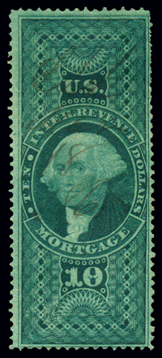 R95cvar,$10 Mortgage, Green, Top Frameline Double Variety, Fine, with 1865 ms ccl, short perforations Cat($55) (Image)