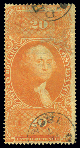 R98c,$20 Conveyance, Orange, Fine-Avg, with light horizontal crease at bottom and 1864 cds ccls Cat($110) (Image)