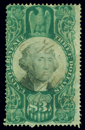 R147,$3.00 Green and Black, Fine-Avg, couple short perforations and "July 11/1872" ms ccl Cat($125) (Image)
