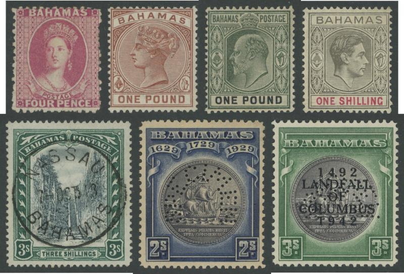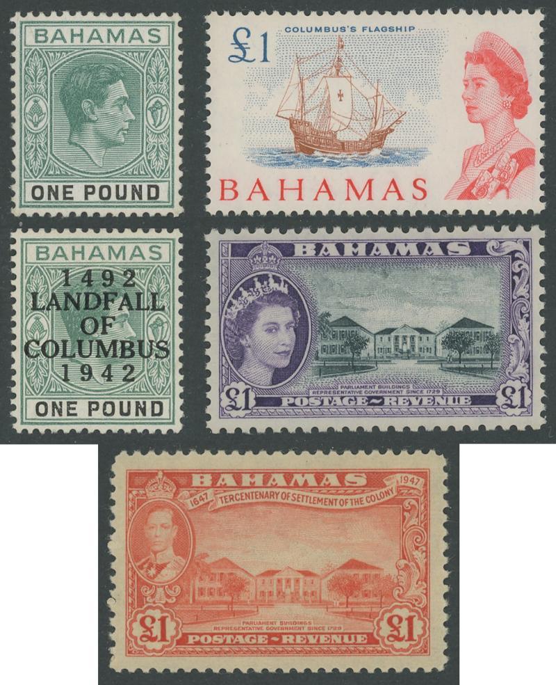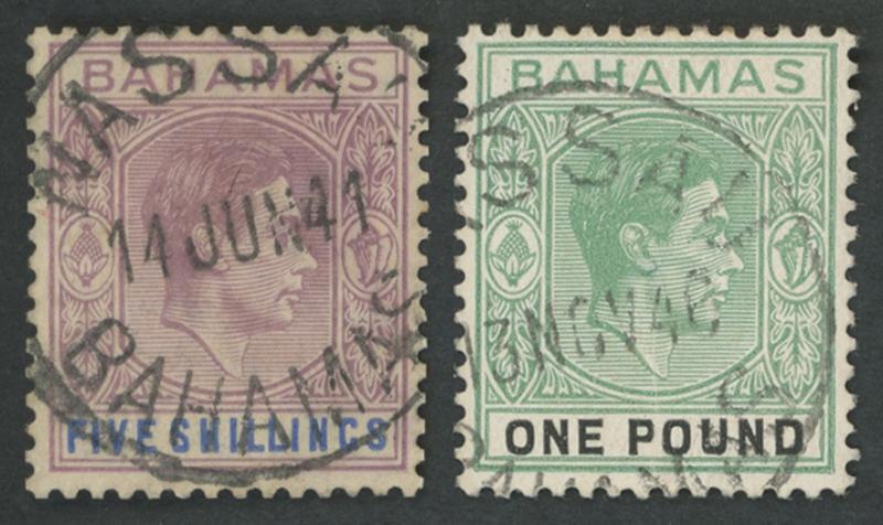 1938-52 KGVI Heads 5/- lilac & blue SG 156 with largely very fine 'NASSAU/14JUN41/BAHAMAS' cds cancel and two further shades used, also 5/- brown-purple & bright blue SG 156d block of 4 and Columbus overprints 5/- block of 4 both with central Nassau cds, plus £1 grey-green & black SG 157 with large-part 'NASSAU/13NOV40/BAHAMAS' cds and £1 blue-green & black SG 157a, condition generally fine to very fine, Cat £500+ minimum.