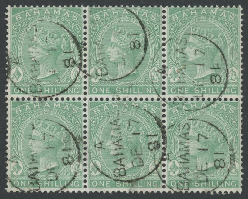 1863-80 QV Crown CC Watermark Perf 14 Thin Paper 1/- green SG 39b block of 6 (3x2) with six light but mostly clear strikes of 'A/BAHAMAS/DE 17/81' cds cancels, Cat £180+ for singles. A very scarce multiple, especially so fine. (Image1)