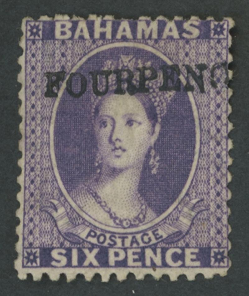 1883 QV Chalons 'FOURPENCE' Surcharge on 6d deep violet SG 45, unused without gum, Cat £600. (Image1)