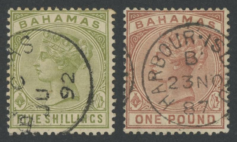 1884-90 QV Crown CA Watermark 5/- sage-green & £1 Venetian red SG 56 & 57, the former with neat small-part Bahamas 1892 cds cancel, the latter with a very fine almost complete strike of 'HARBOUR.ISLAND/B/23NO/87' cds cancel, Cat £360+. (2) (Image1)