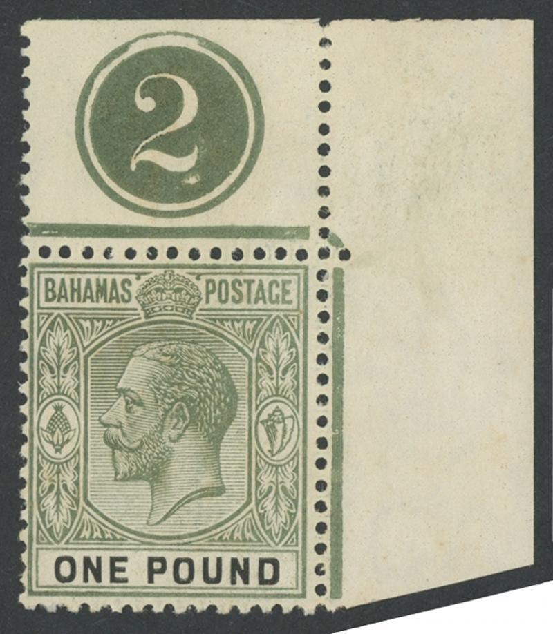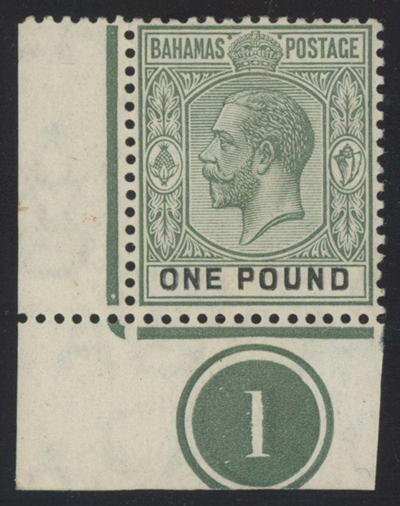 1912-19 KGV Keyplates Multiple Crown CA Watermark £1 green & black SG 89, corner Plate Number '1' single from the upper-right of the sheet, tied to small linen-backed piece by small-part Nassau cds cancel, Cat £375+. (Image1)