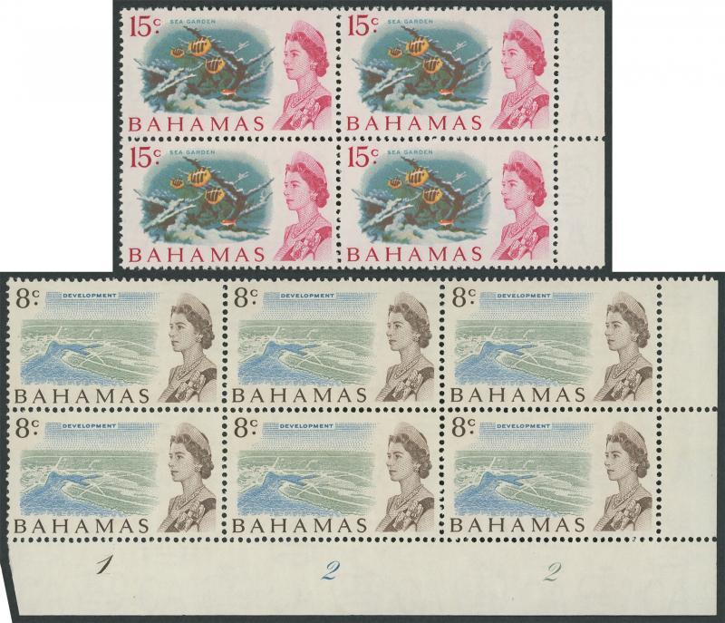 1967-71 QEII Pictorials Whiter (Woodfree) Paper 1c to $3 set SG 295a-309a (ex 12c) mostly blocks of 4, the 1c, 2c, 5c, 10c, 11c, 22c & 50c with Plate Numbers, the 4c x2 and 8c in lower-right corner Plate Number blocks of 6, very fine unmounted, Cat £2400+ for singles.