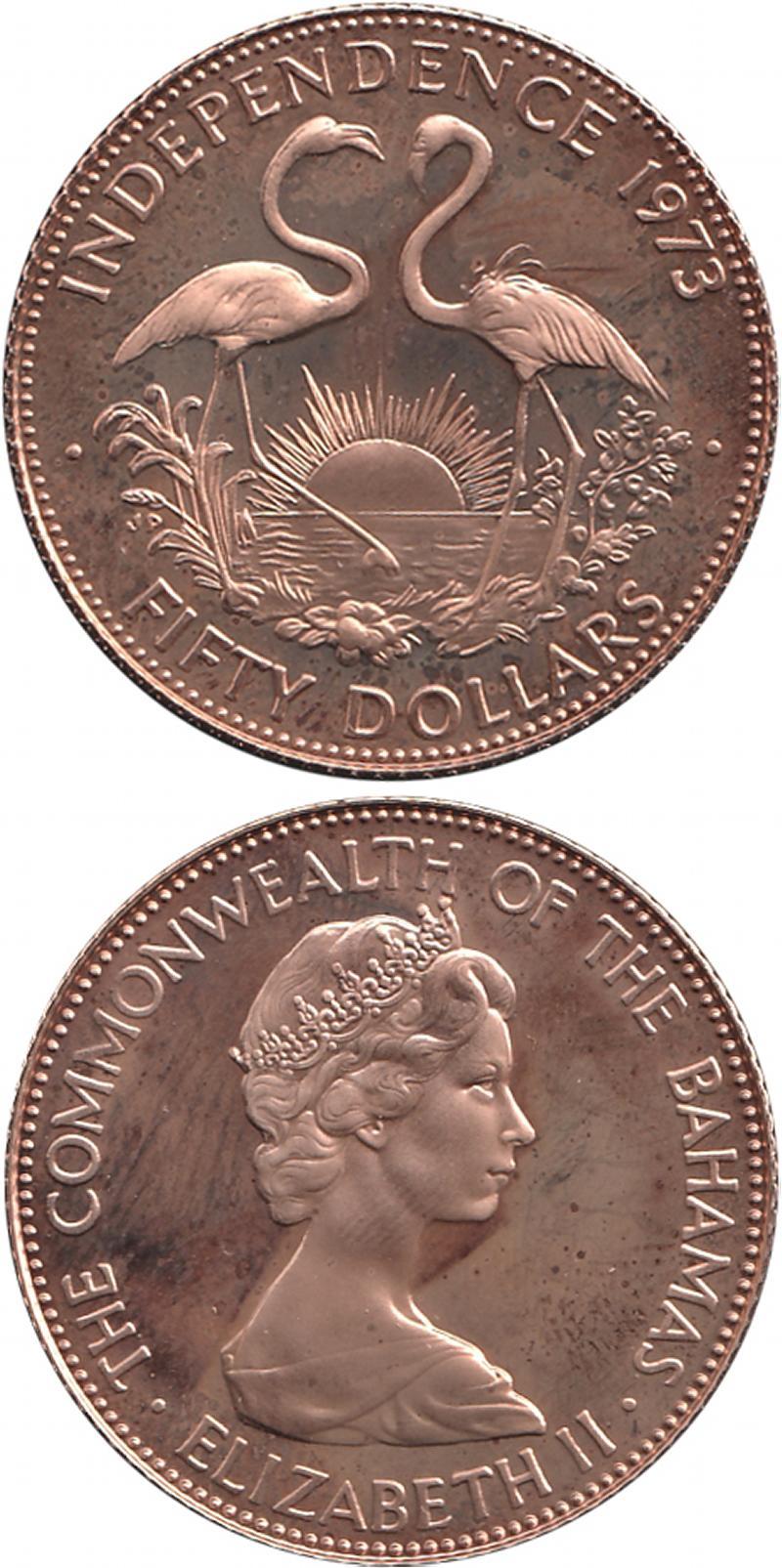 1973 $50 gold (15.7g 0.500) Independence Day KM 48, rev. two flamingos facing, sunrise over ocean between, Uncirculated. (Image1)