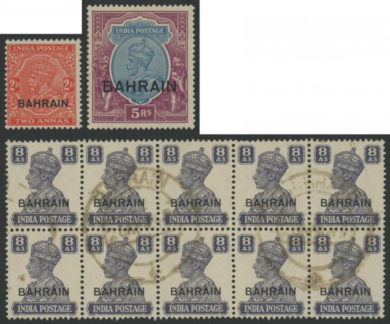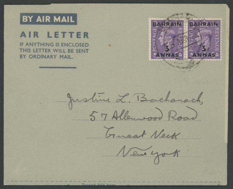 AEROGRAMMES: 1949 usage of British formular 'AIR LETTER' with Overprints on GB '3/ANNAS' on 3d pair tied by Indian-pattern 'BAHRAIN' cds, philatelic usage to the USA. (Image1)