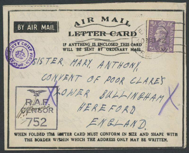AEROGRAMMES: 1942 black/white British Forces 'AIR MAIL/LETTER CARD' with letter headed "RAF/Bahrain Islands/Persian Gulf/PAIFORCE/Oct 30 1942", to England with boxed 'RAF/CENSOR/752' and GB 3d tied as usual by 'EGYPT/10NO42/POSTAGE/PREPAID' machine, 'CALLOW/8DE/42/HEREFORD' arrival backstamp. Transit 11 days to Cairo plus 28 days to England, suggesting carriage was wholly by surface. The writer states "I have moved to another part of the island, which makes it a bit difficult in getting to church ...". Persia & Iraq Force (PAIFORCE) was operational in Iraq from 1942. Staging Post 43 was at Bahrain. (Image1)