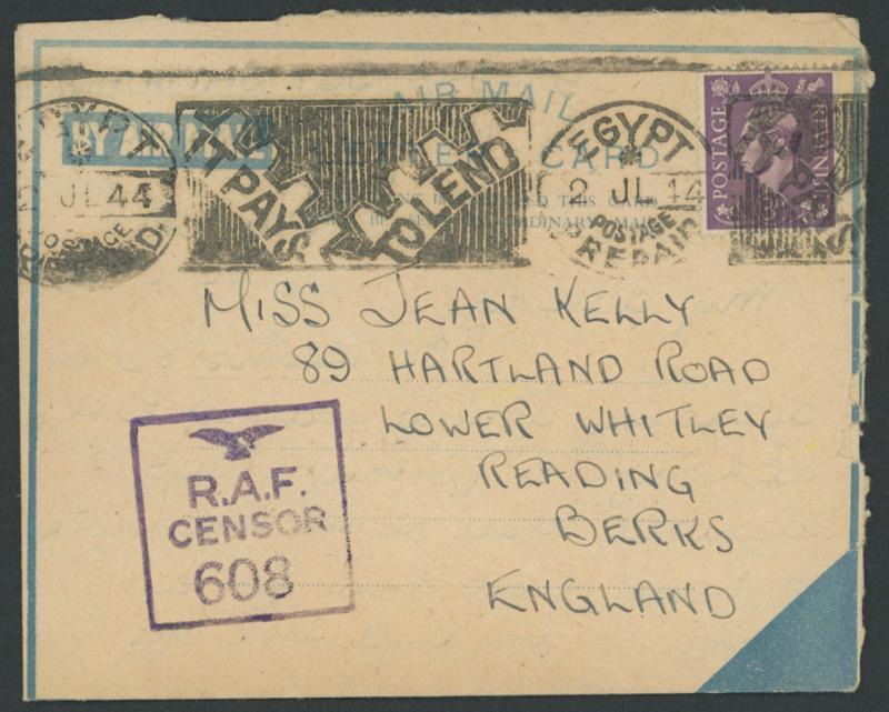 AEROGRAMMES: 1944 blue/white Indian-pattern Forces 'AIR MAIL/LETTER CARD' with Blue Triangle at Lower-Right & Printed Honour Clause on the Reverse, letter headed "No 43 Staging Post/RAF/ PAIFORCE/26.6.44", to England with boxed 'RAF/CENSOR/608' and GB 3d tied as usual by a remarkably fine 'EGYPT/2JL44/POSTAGE/PREPAID' machine, opened a little roughly at right and slightly aged. The writer states: "...Although we live in grass huts [!], electric fans are installed...there are no WAAFS here..." (Image1)