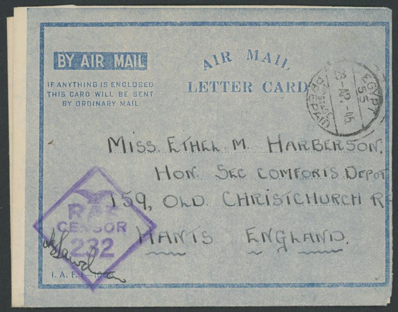 AEROGRAMMES: 1945 blue/white Indian-pattern Forces 'AIR MAIL/LETTER CARD' with Return Address Lines on the Reverse, letter headed "43 Stageing Post/RAF PAIFORCES/April 19th 1945", to Hampshire GB with diamond 'RAF/CENSOR/232' and 'EGYPT/ 55 /23-AP-45/POSTAGE/PREPAID' cds. By this stage airletters could be sent free of charge. The letter states: "...receiving mail is one of the few pleasures we get out here. We do have an open air cinema..." (Image1)