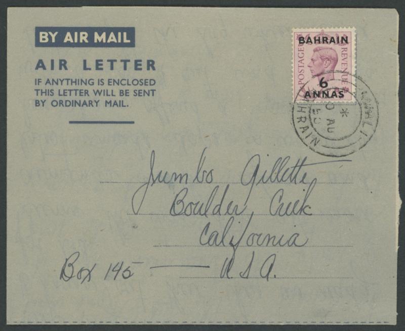 AEROGRAMMES: 1950 social usage of British formular 'AIR LETTER' with Overprints on GB '6/ANNAS' on 6d tied by British-pattern 'AWALI/10AU/50/BAHRAIN' cds, to California USA. The writer speaks of having had a lengthy illness and suffered significant weight-loss "...seems the war has put more demands on this refinery..." Usage of the Overprints on Aerogrammes is much scarcer than on envelopes. Awali is an oil-producing area on Bahrain Island that was established in the 1930s by the Bahrein Petroleum Co. (Image1)