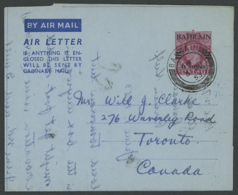 AEROGRAMMES: 1953 usage of British 6d KGVI 'AIR LETTER' overprinted 'BAHRAIN/6 annas' with message headed "Box 275/Awali/.../June 1 1953" that states "The PO is closed tomorrow but I will put this in the box anyway in the hope that it might get postmarked June 2nd...", to Canada with British-pattern 'BAHRAIN/3JU/53' cds which - according to Werner Wiegand - was the First Day of Issue. Interesting. (Image1)