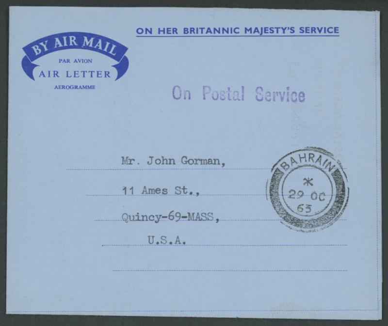 AEROGRAMMES: 1960 (circa) British-pattern formular issue with 'ON HER BRITANNIC MAJESTY'S SERVICE' Header & 'BRITISH POSTAL AGENCIES/BAHRAIN' within, an unused example and two to Massachusetts USA with different 'On Postal Service' handstamp in violet used at 'BAHRAIN' (with typed message stating "...the British Postal Agencies are Bahrain, Abu Dhabi (Trucial States), Muscat..." & signed "PJ Crowley/for Postal Superintendent"), or 'MUSCAT' (backstamp of 29DE/62).