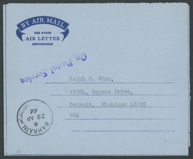 AEROGRAMMES: 1966 usage of British-pattern formular issue with 'On Postal Service' handstamp in violet and 'BAHRAIN' cds, typed message headed "Government of Bahrain/Post Office/Bahrain (Arabian Gulf)" and signed "FW Thorpe" over 'Director of Posts' advising of the upcoming 30f aerogramme showing "the outline of the Bahrain Islands". Unusual official usage of a non-official form. (Image1)