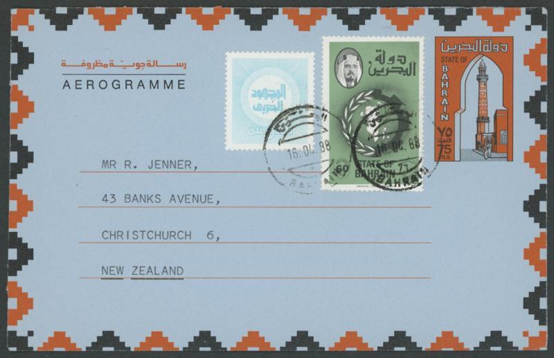 AEROGRAMMES: 1988 social usage of Tower 75f issue to New Zealand uprated with 60f Map of Bahrain plus Obligatory Tax stamp tied by bilingual bridge '.../BAHRAIN' cds. (Image1)