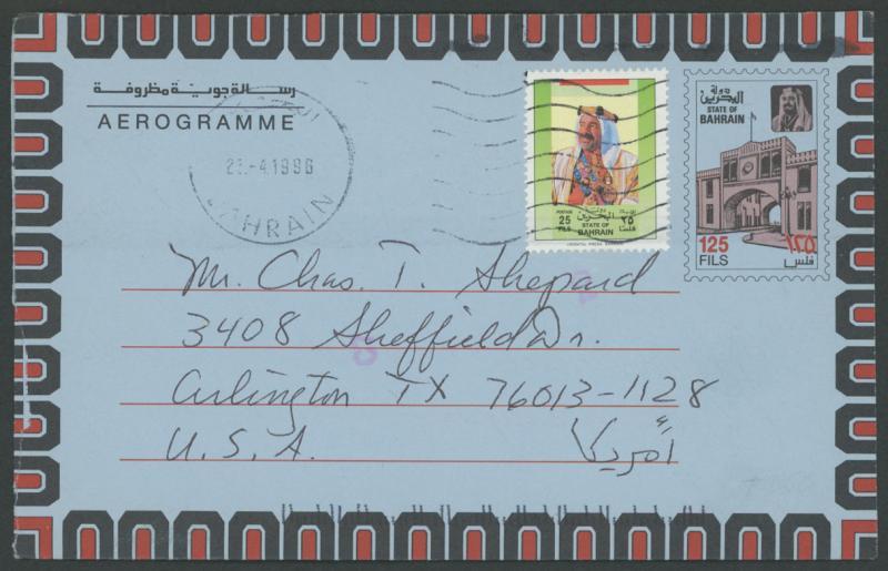 AEROGRAMMES: 1996 social usage of 125f Monumental Gate Jones BAL19, to Texas USA with 25f Ruler tied by bi-lingual '.../23-4 1996/BAHRAIN' machine, the message from an American ex-pat states "...I'm back for another 3 years...My goal for this term...dub a Dutch-produced video into Gulf Arabic..." Terry Jones gives the earliest recorded usage as 1994. (Image1)