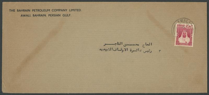 POSTAL HISTORY: 1958 (April 3) Bahrain Petroleum Co, Awali, Bahrain, Persian Gulf long-format envelope used locally with Local Stamps Shaikh Salman 6p carmine solo tied by largely very fine 'AWALI' cds cancel. (Image1)